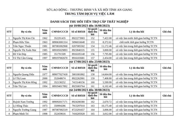 DANH SÁCH THU HỒI TIỀN TRỢ CẤP THẤT NGHIỆP NĂM 2023 (TỪ 10/8/2023 - 30/8/2023)