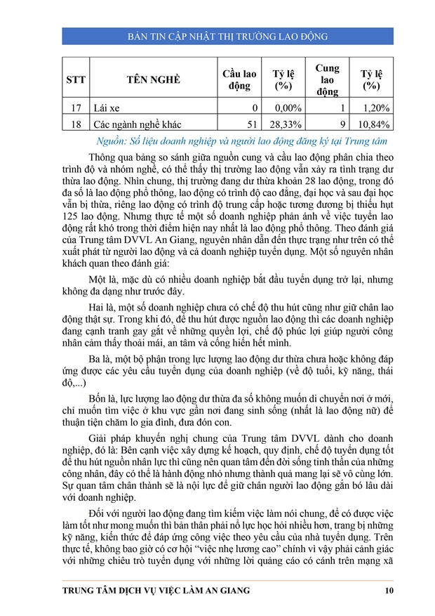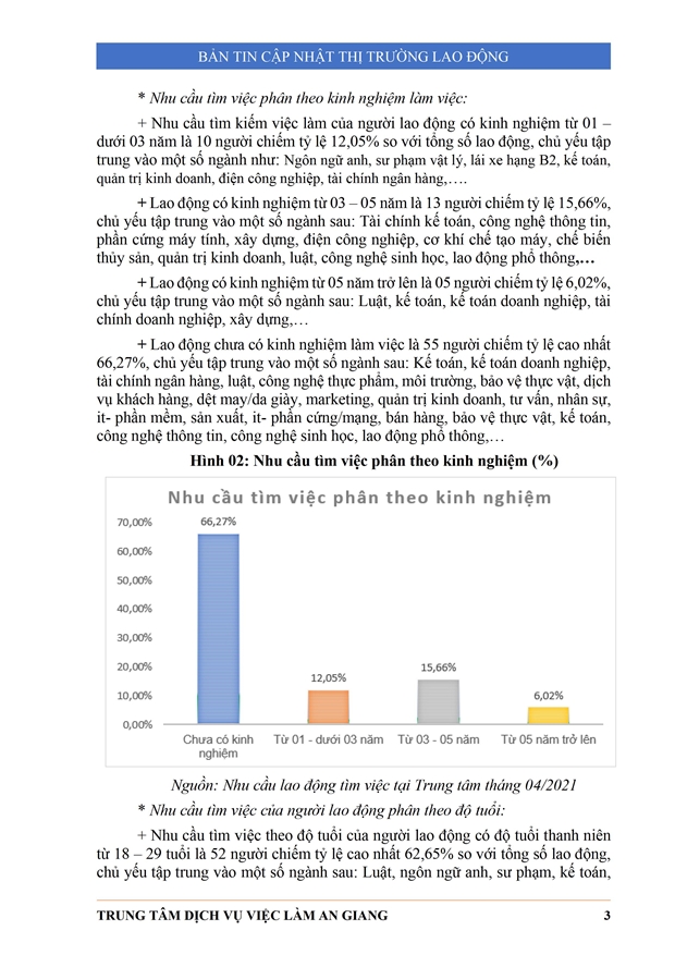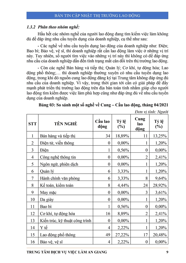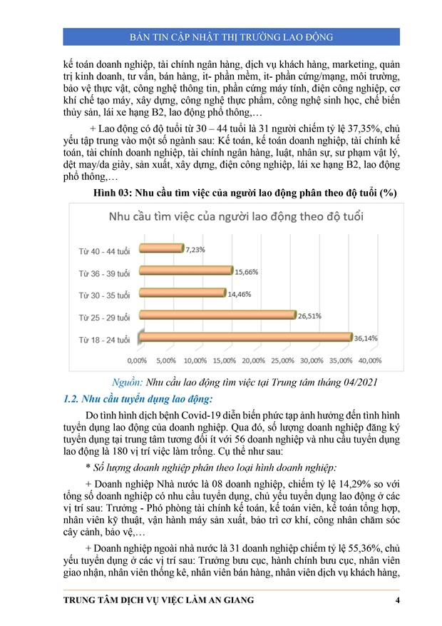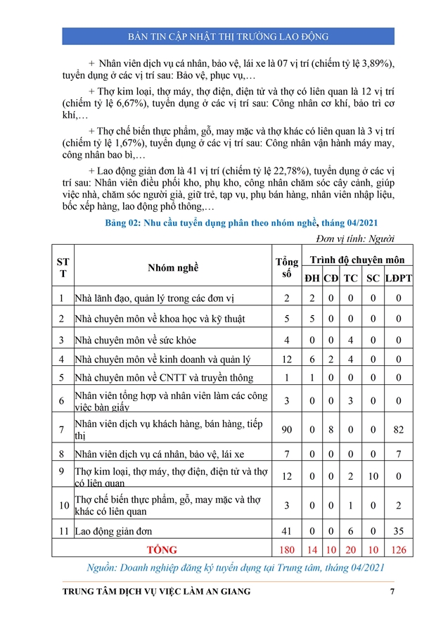 Trong tháng 4 năm 2021, số lượt người lao động đăng ký tìm việc làm qua hệ thống Trung tâm Dịch vụ việc làm An Giang là 83 người (nữ: 48 người) cao hơn 23 người so với tháng 03/2021. Trong khi đó, do tình hình dịch bệnh Covid-19 diễn biến phức tạp ảnh hưởng đến tình hình tuyển dụng lao động của doanh nghiệp. Qua đó, số lượng doanh nghiệp đăng ký tuyển dụng tại trung tâm tương đối ít với 56 doanh nghiệp và nhu cầu tuyển dụng lao động là 180 vị trí việc làm trống.