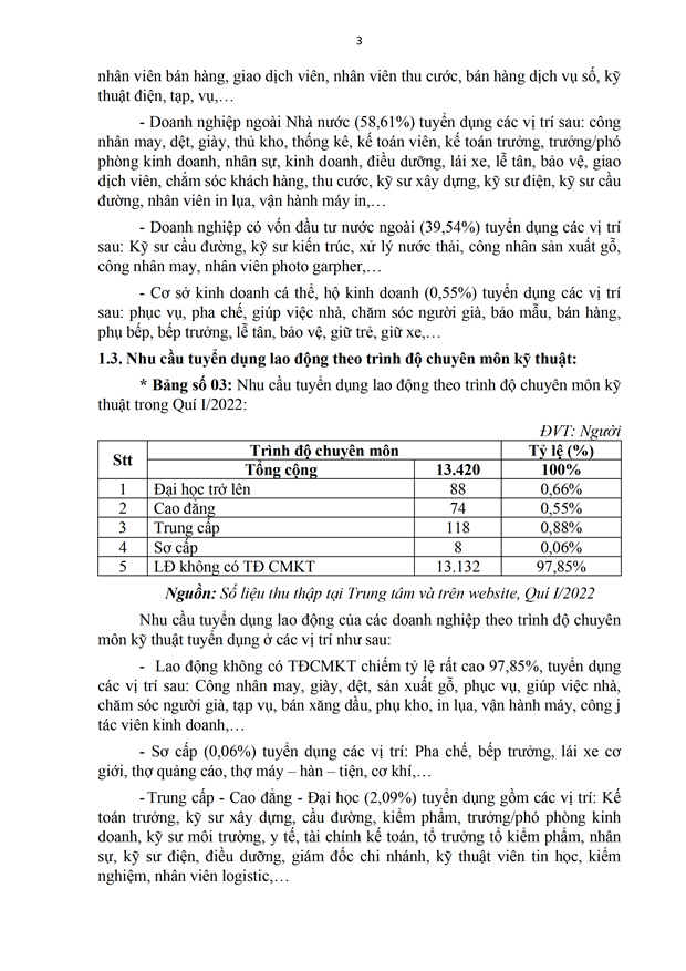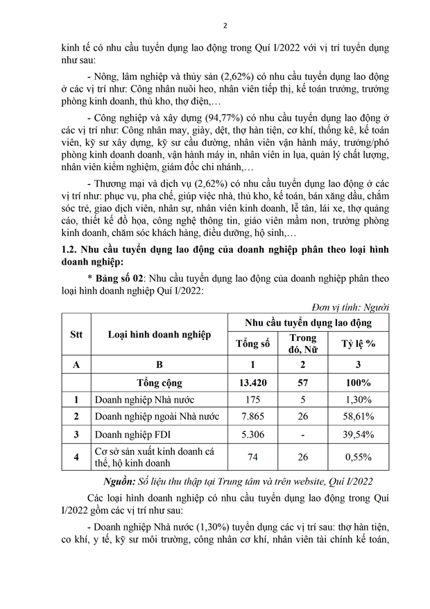 Trong Quí I/2022, Trung tâm Dịch vụ việc làm tỉnh An Giang đã thu thập, khảo sát thông tin thị trường lao động trên địa bàn tỉnh. Qua đó, đã thu thập được tổng cộng 281 doanh nghiệp tăng 105,11% so với Quí IV/2021 và tăng 71,34% so với cùng kỳ năm 2021, với nhu cầu tuyển dụng 13.420 người và 196 lao động có nhu cầu tìm kiếm việc làm tăng 12% so với Quí IV/2021 và giảm 12,50% so với cùng kỳ năm 2021.