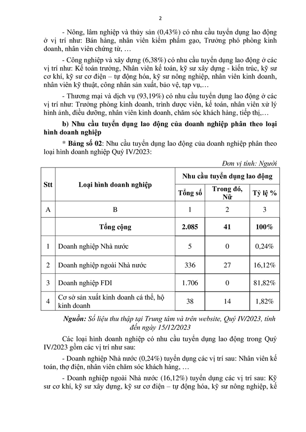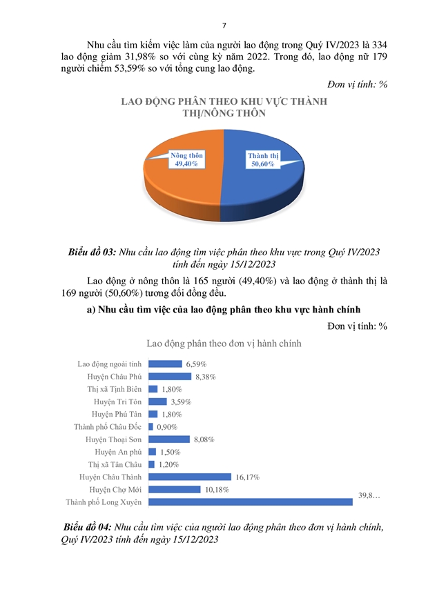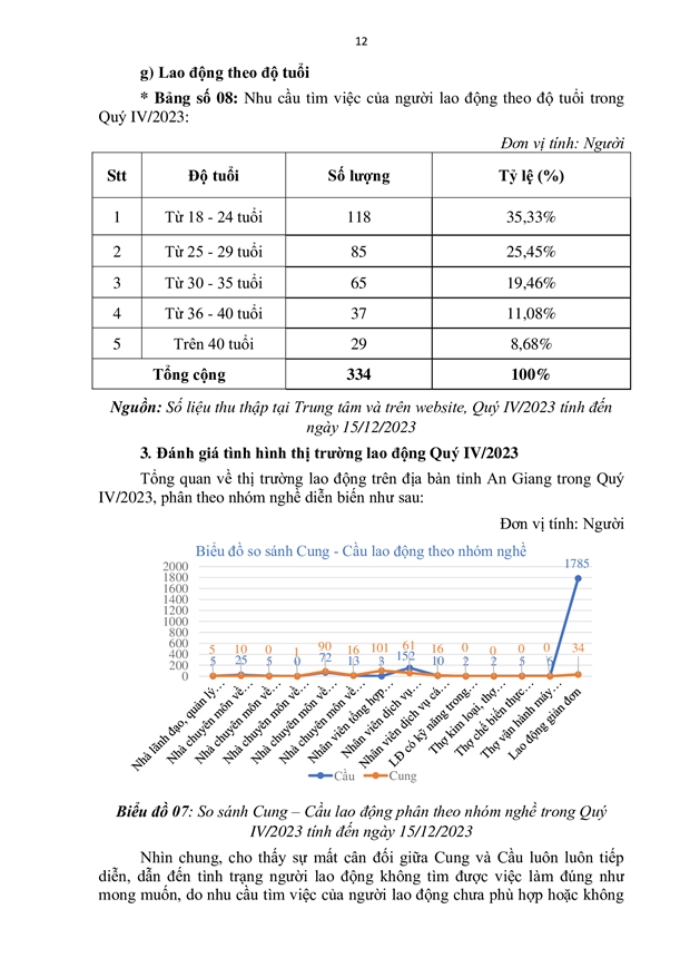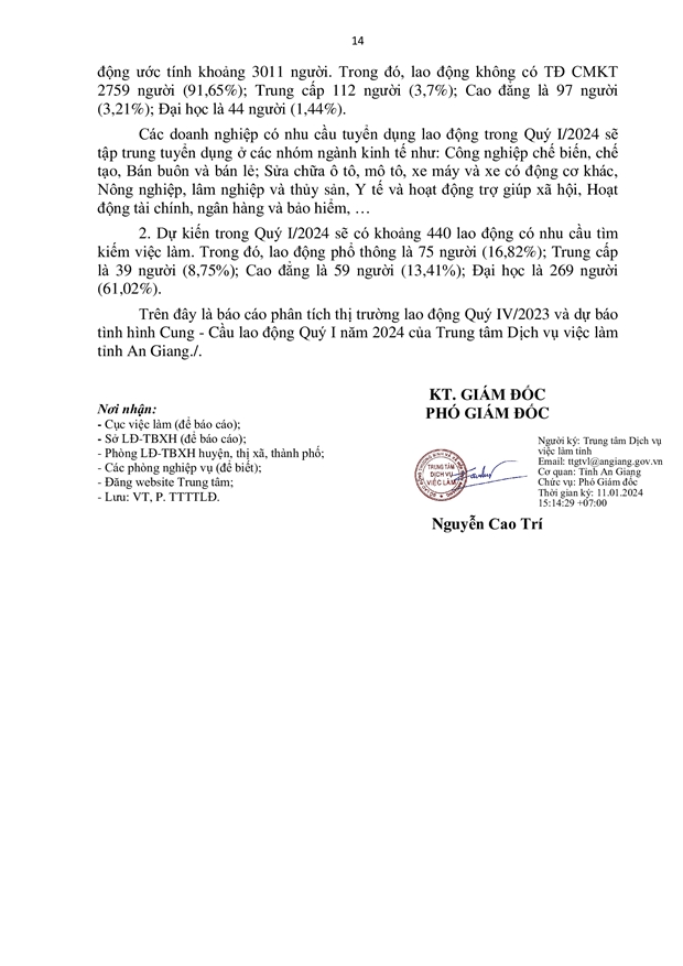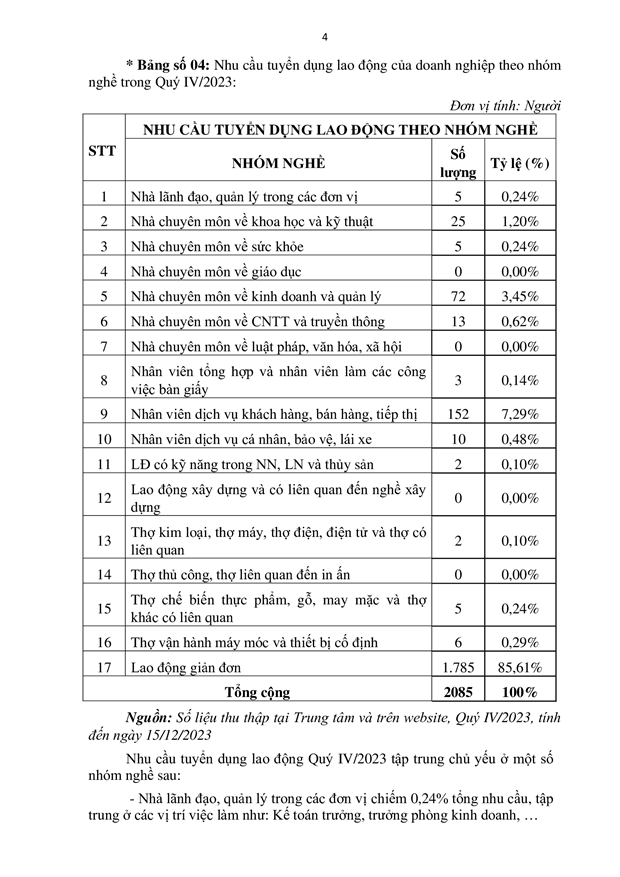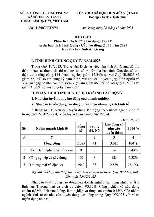 Trong Quý IV/2023, Trung tâm Dịch vụ việc làm tỉnh An Giang đã thu thập, khảo sát thông tin thị trường lao động trên địa bàn tỉnh. Qua đó, đã thu thập được tổng cộng 144 doanh nghiệp giảm 17,24% so với Quý III/2023 và giảm 52,16% so với cùng kỳ năm 2022, với nhu cầu tuyển dụng 2085 người và 334 lao động có nhu cầu tìm kiếm việc làm giảm 46,98% so với Quý III/2023 và giảm 31,98% so với cùng kỳ năm 2022.