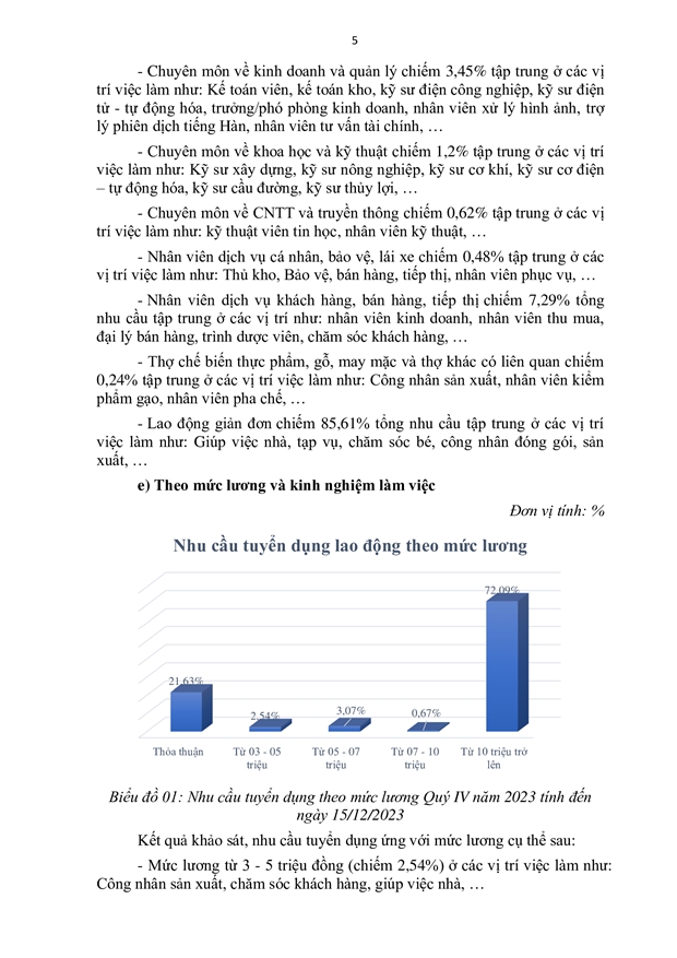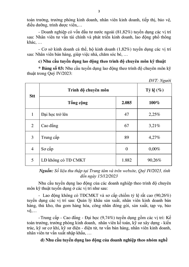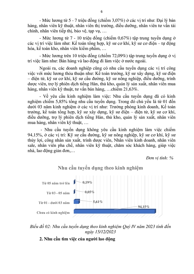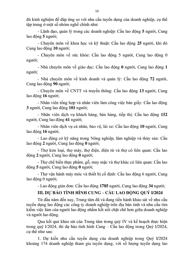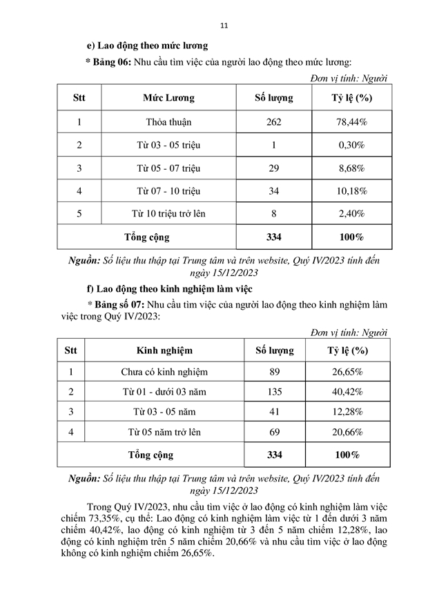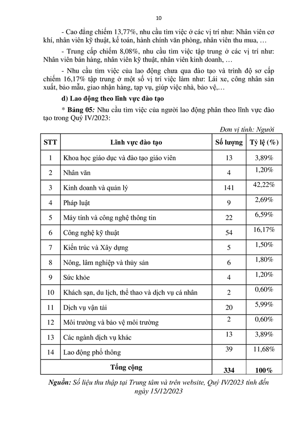Trong Quý IV/2023, Trung tâm Dịch vụ việc làm tỉnh An Giang đã thu thập, khảo sát thông tin thị trường lao động trên địa bàn tỉnh. Qua đó, đã thu thập được tổng cộng 144 doanh nghiệp giảm 17,24% so với Quý III/2023 và giảm 52,16% so với cùng kỳ năm 2022, với nhu cầu tuyển dụng 2085 người và 334 lao động có nhu cầu tìm kiếm việc làm giảm 46,98% so với Quý III/2023 và giảm 31,98% so với cùng kỳ năm 2022.
