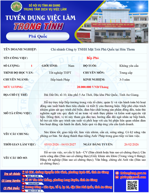 Chi nhánh Công ty TNHH Mặt Trời Phú Quốc tại Hòn Thơm tuyển dụng