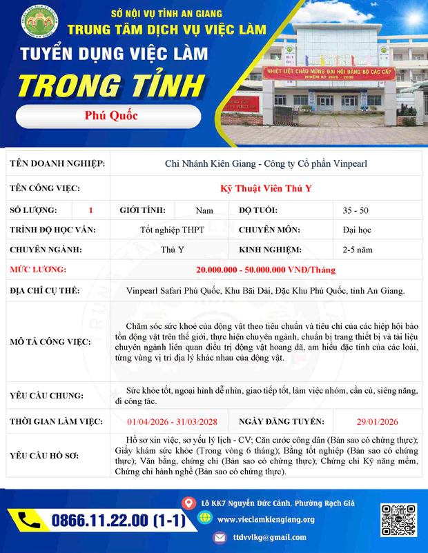 Chi Nhánh Kiên Giang - Công ty Cổ phần Vinpearl tuyển dụng Kỹ thuật viên Thú Y