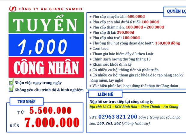 CÔNG TY AN GIANG SAMHO TUYỂN DỤNG