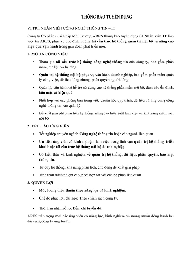 CÔNG TY CỔ PHẦN GIẢI PHÁP MÔI TRƯỜNG ARES THÔNG BÁO TUYỂN DỤNG