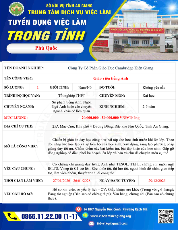 Công Ty Cổ Phần Giáo Dục Cambridge Kiên Giang tuyển dụng Giáo viên tiếng Anh