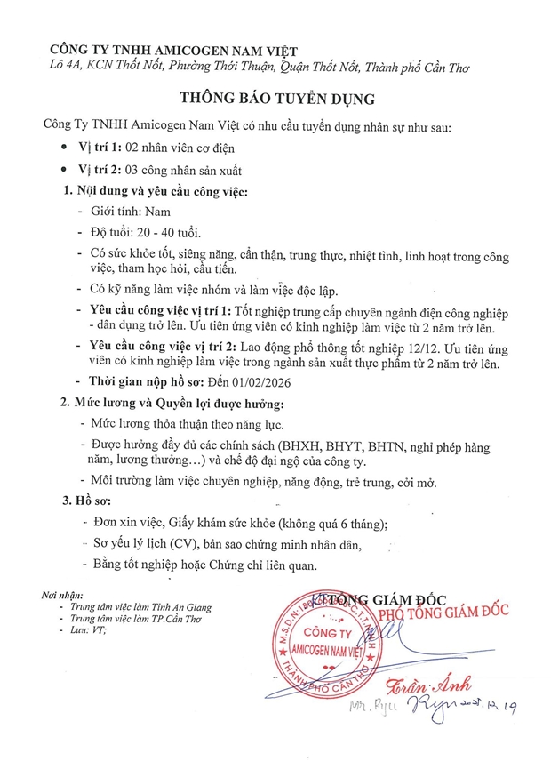 CÔNG TY TNHH AMICOGEN NAM VIỆT TUYỂN DỤNG