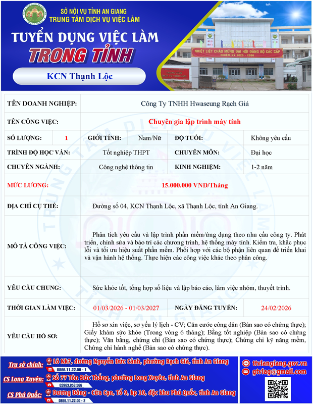 Tuyển Kỹ thuật máy tính bán thời gian , vừa học vừa làm làm việc tại Long Xuyên - An Giang