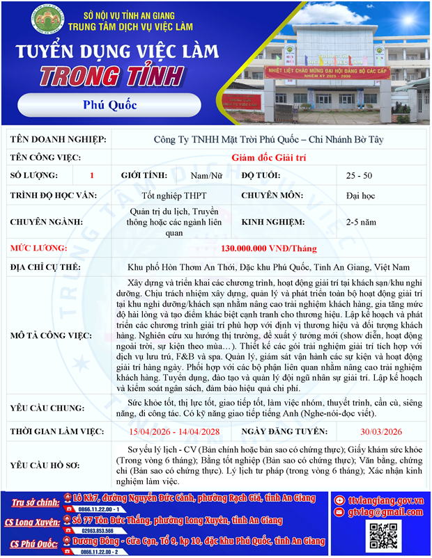 Công Ty TNHH Mặt Trời Phú Quốc – Chi Nhánh Bờ Tây tuyển dụng