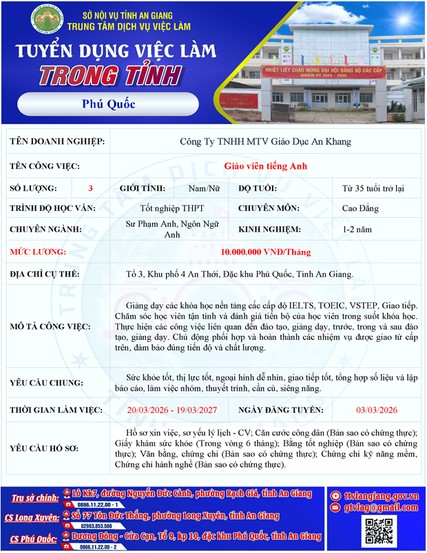 TRUNG TÂM DỊCH VỤ VIỆC LÀM TỈNH AN GIANG THÔNG BÁO TUYỂN DỤNG VIỆC LÀM TRONG TỈNH