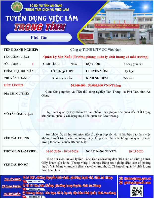 Công ty TNHH MTV JIC Việt Nam tuyển dụng trưởng phòng quản lý chất lượng