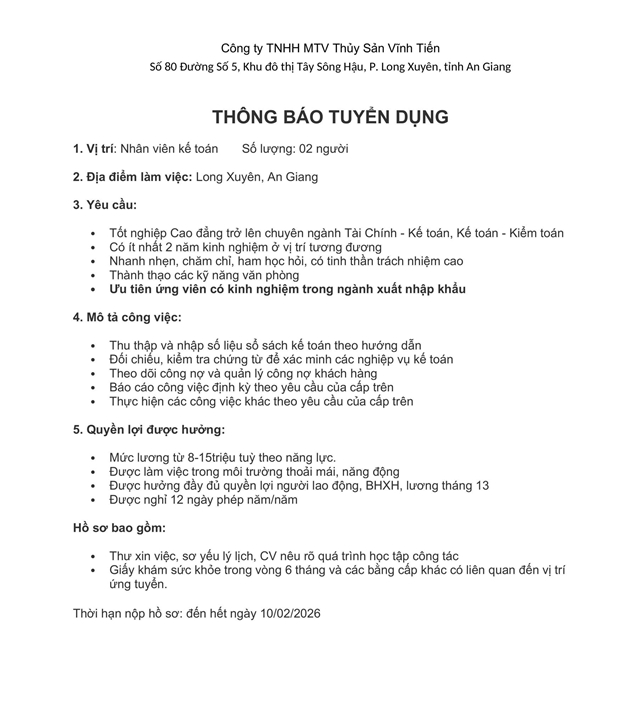 CÔNG TY TNHH MTV THỦY SẢN VĨNH TIẾN TUYỂN DỤNG