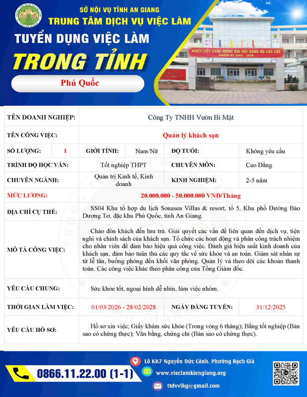 Công Ty TNHH Vườn Bí Mật tuyển dụng Quản lý khách sạn