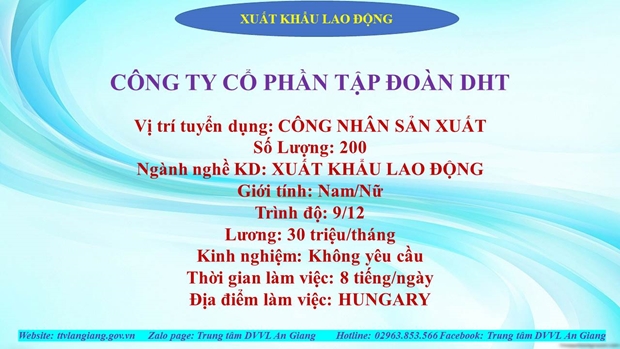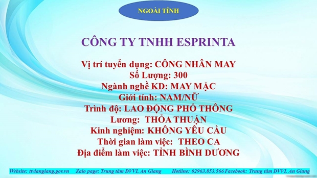 TUYỂN 20 KỸ THUẬT MAY, 20 TỔ TRƯỞNG CHUYỀN MAY, 20 TỔ PHÓ CHUYỀN MAY LÀM VIỆC TẠI AN GIANG.