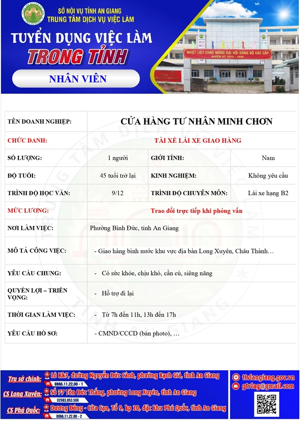 Liên hệ với Trung tâm: Phòng Đào tạo - Tư vấn Việc làm, Trung tâm Dịch vụ việc làm tỉnh An Giang