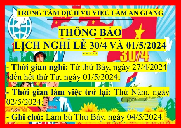Trung tâm Dịch vụ việc làm An Giang Thông báo lịch nghỉ lễ 30/4 và 01/5 với nội dung cụ thể như sau: