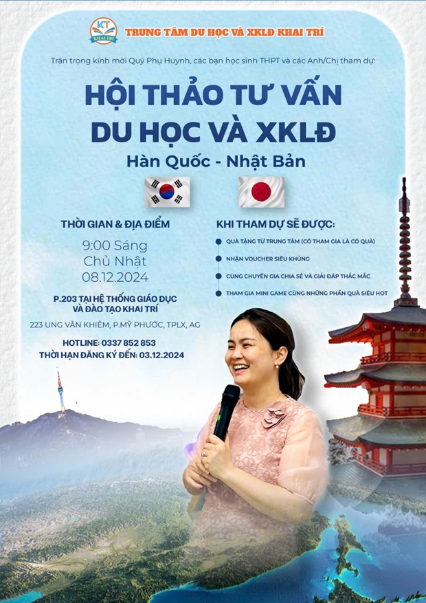Trung tâm Du học - Xuất khẩu lao động Khai Trí long trọng tổ chức “Hội thảo tư vấn Du học và XKLĐ Nhật, Hàn”.
